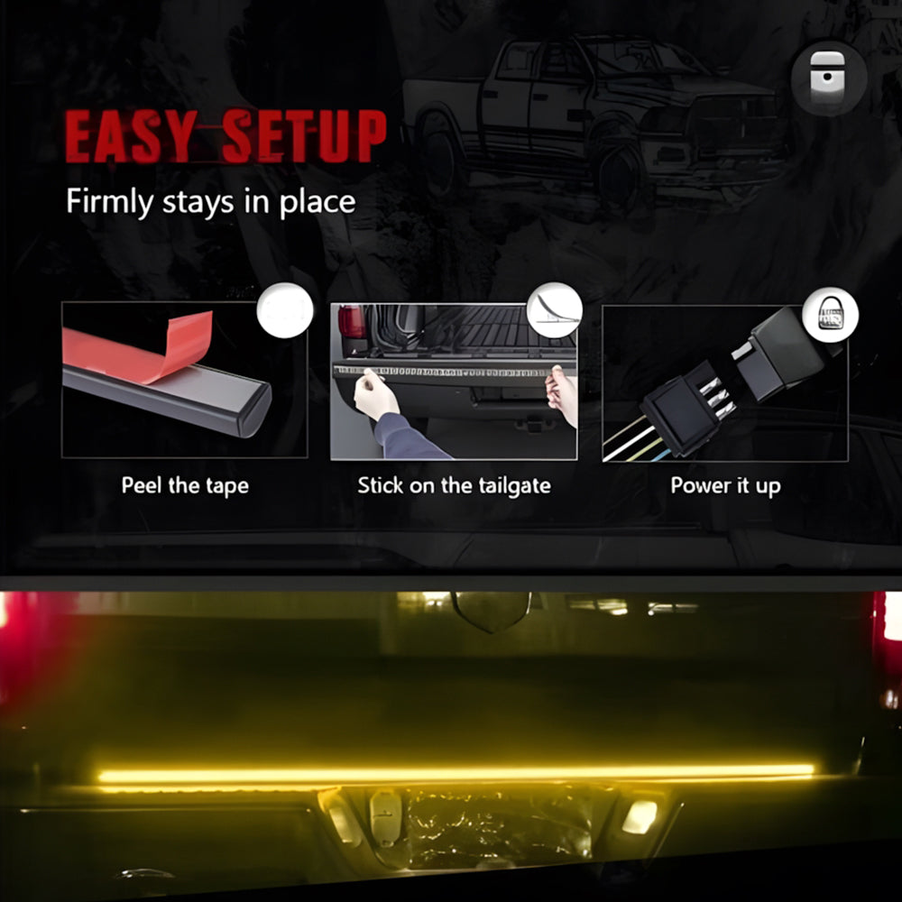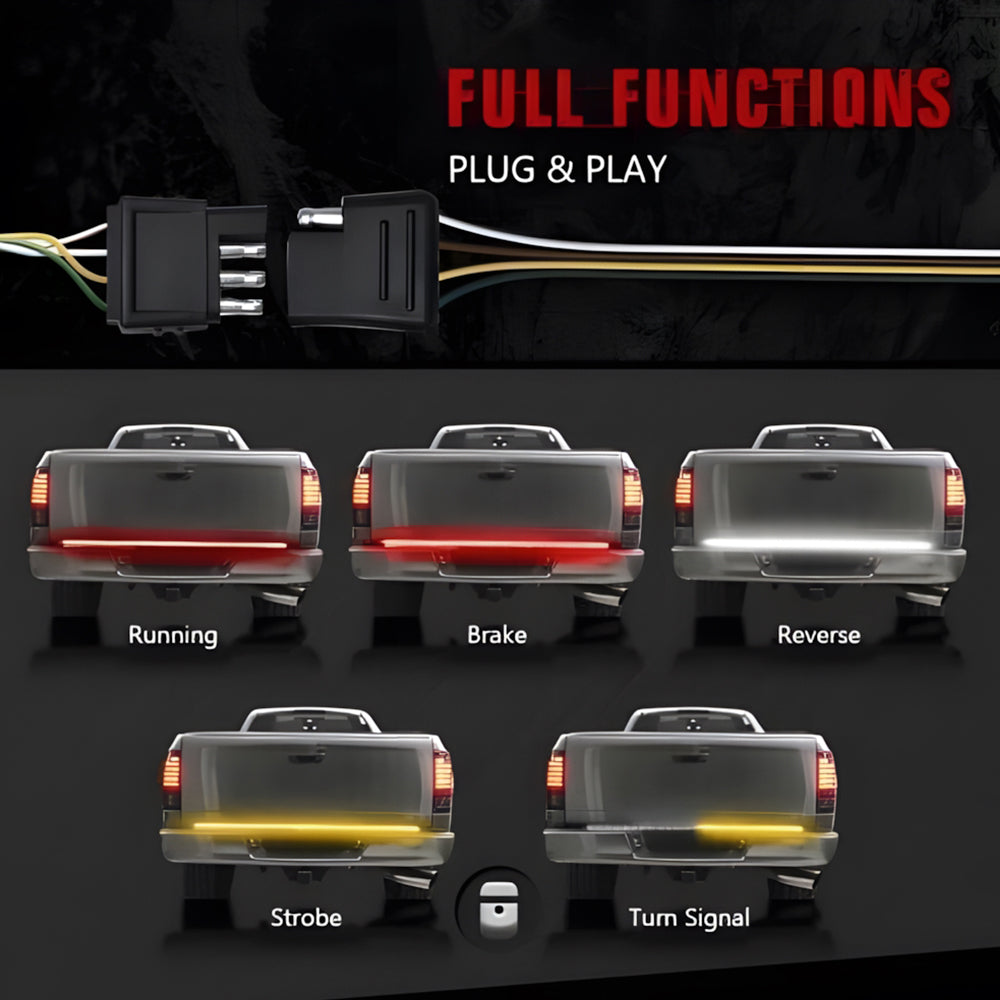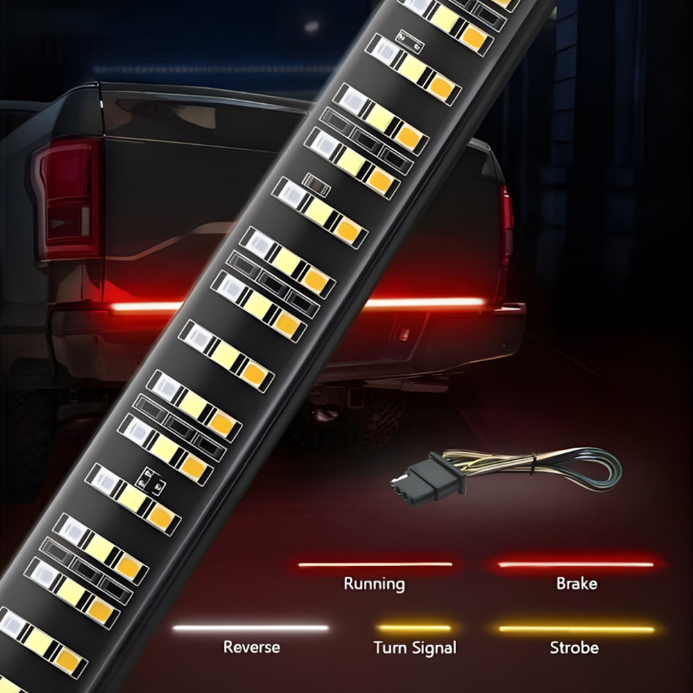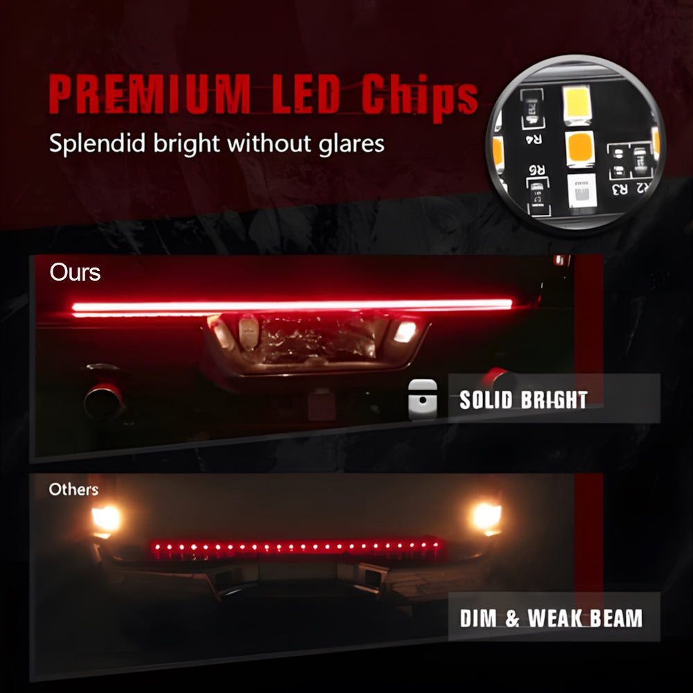 - FULL FUNCTIONS - Features full functions of brake, turn signal, running, reverse and strobe light. The Triple-row tailgate light emits low Red for running, Bright Red for braking, Amber for left/right turning signals, White for reversing, and Flash Amber for emergency strobe light. Let everyone behind you clearly knows what's your next step!