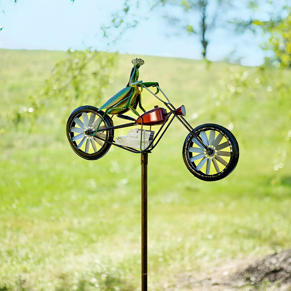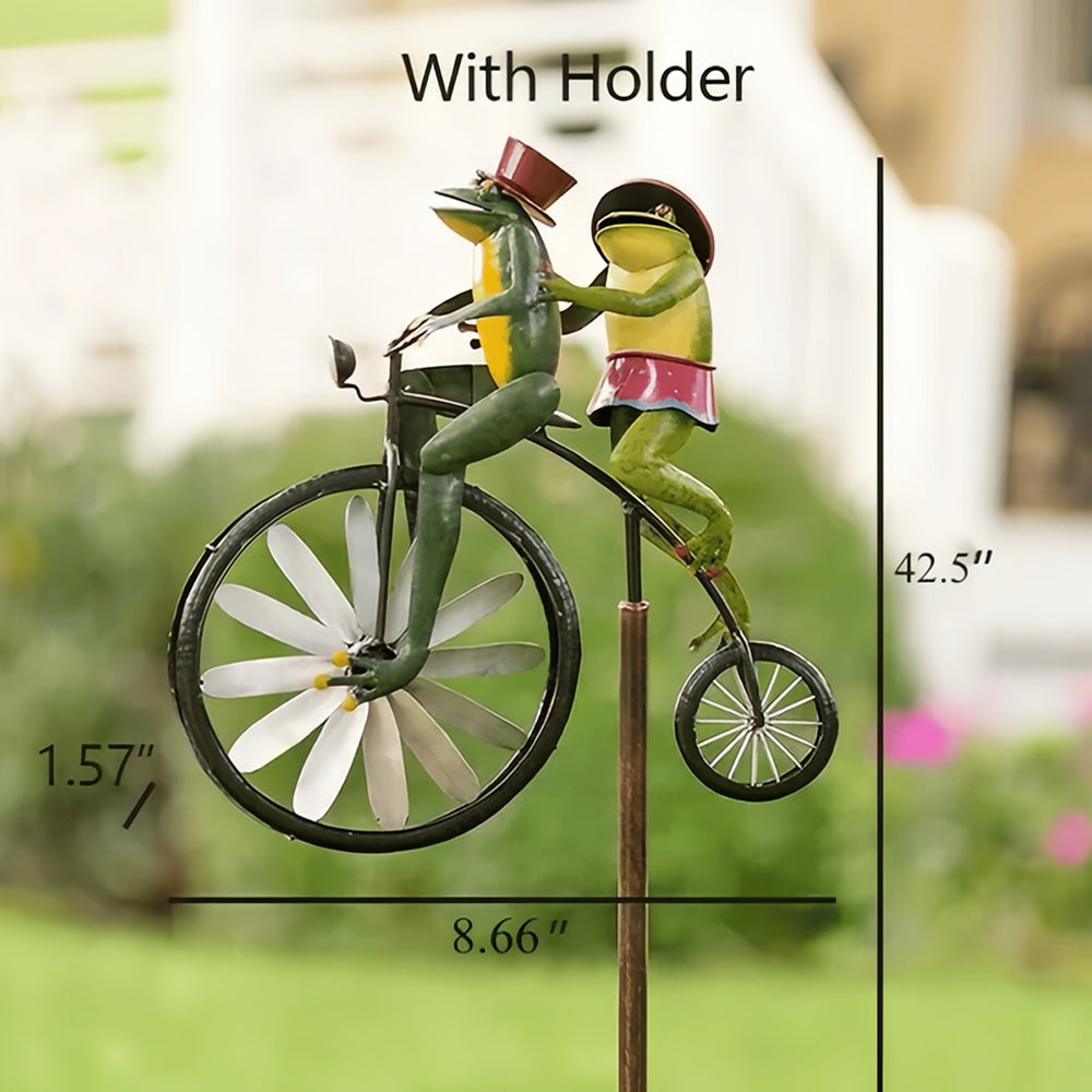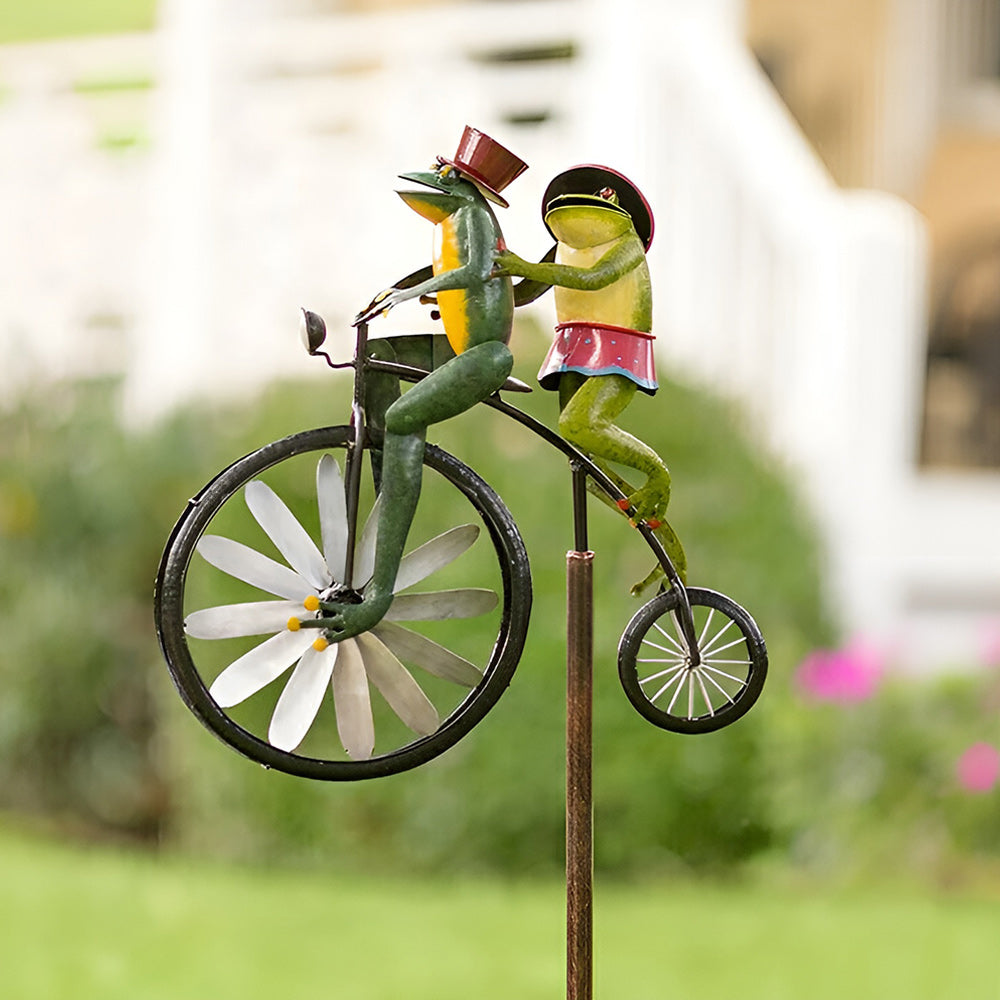A pair of anachronistic amphibians are the stars of this handcrafted metal kinetic garden art.The spokes of his enormous front wheel will spin in the breeze and cause his legs to move up and down in a peddling motion.A delightfully fanciful garden decoration with a unique spin when the wind blows.