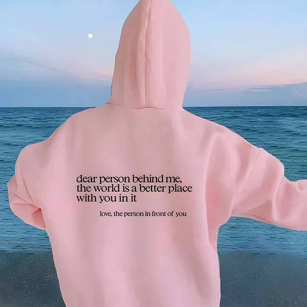 By wearing the "Dear Person Behind Me" sweatshirt, you'll be spreading positivity & kindness wherever you go.