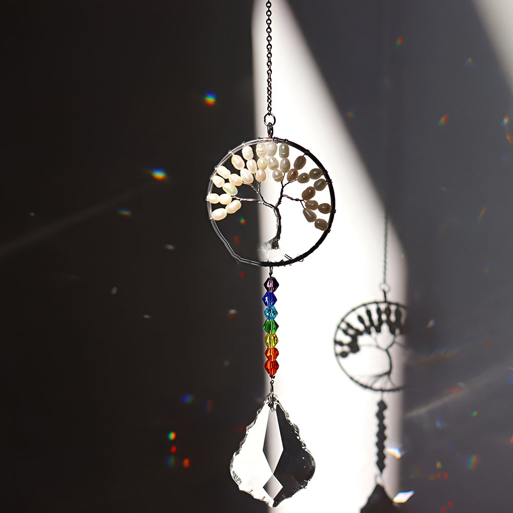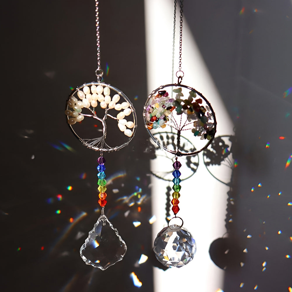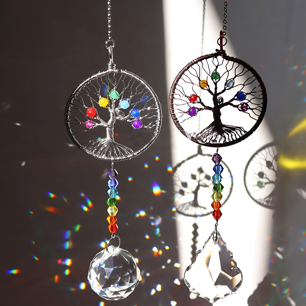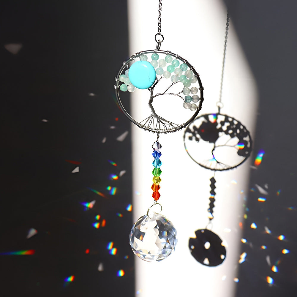 - Crystal Wind Chime Tree Of Life Suncatcher is made from metal and K9 crystals which create gorgeous rainbow lights when they are exposed to sunlight!