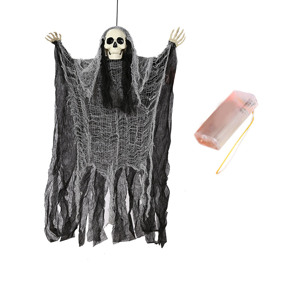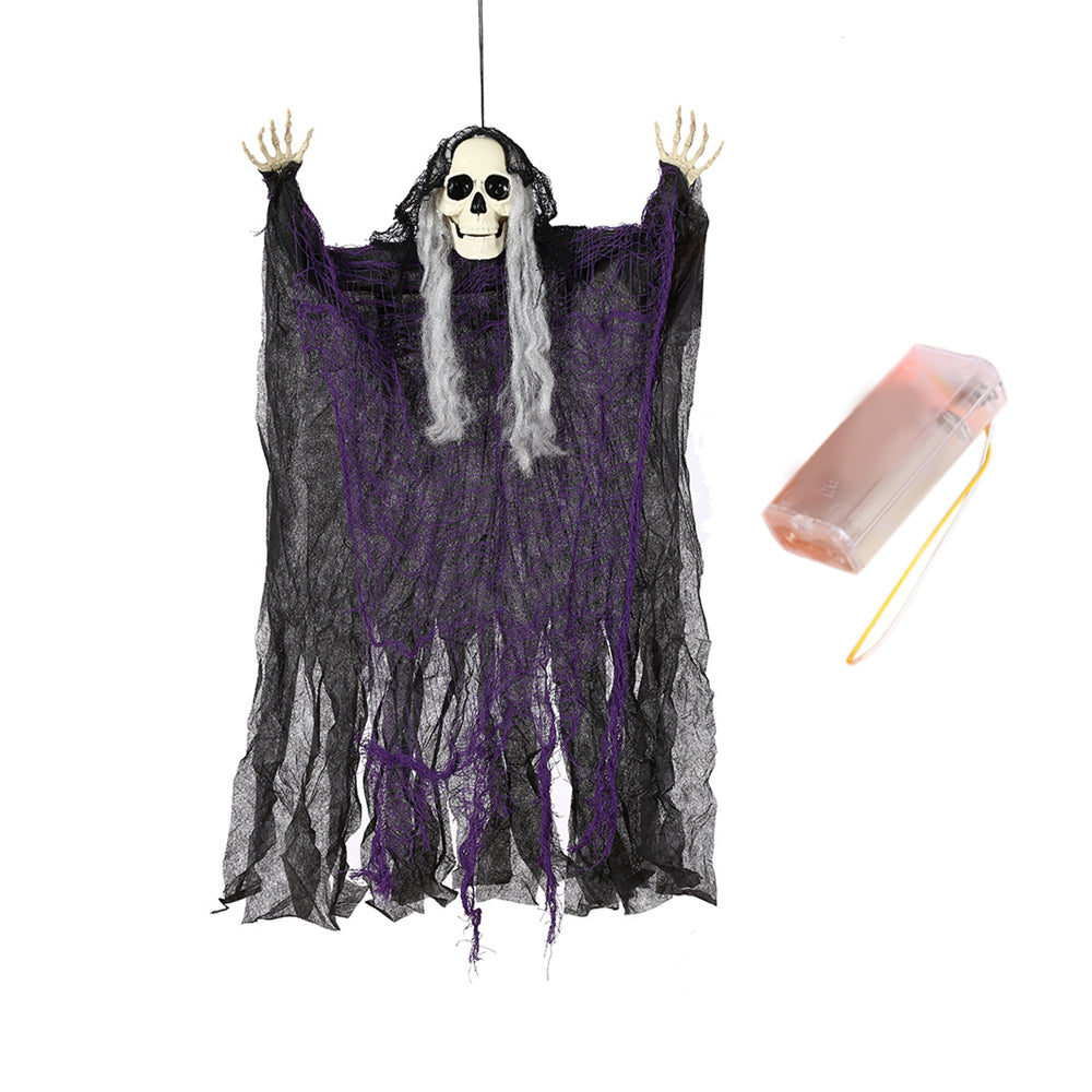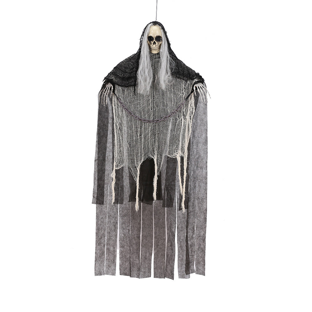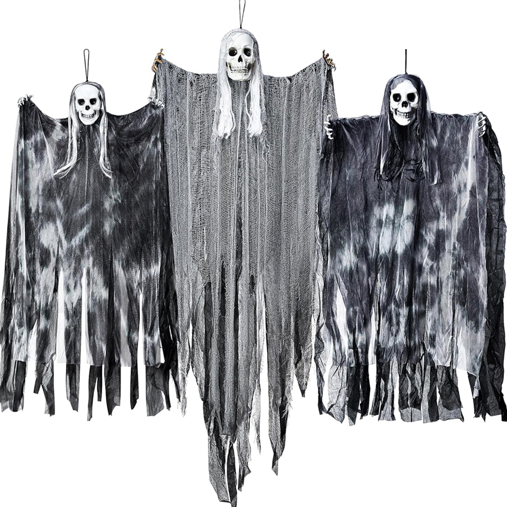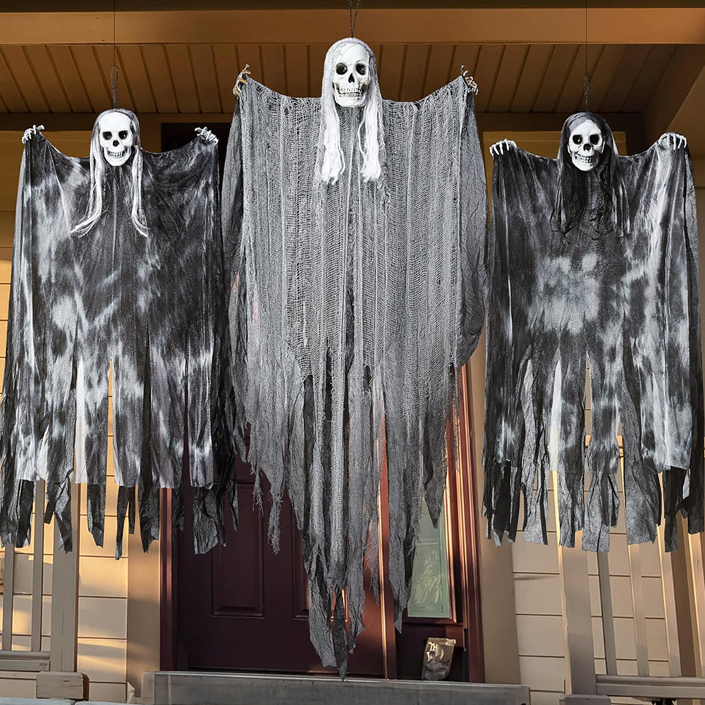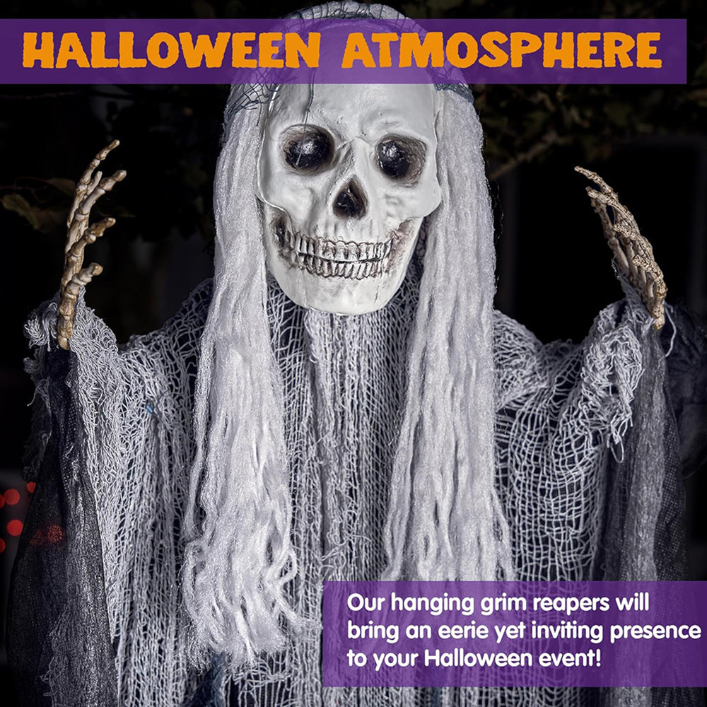 - SCARY LOOK: Hanging these creepy grim reapers with flowing robe and their creepy skull heads, white hair and hands on trees, windows, or doorways to create a spooky atmosphere at your Halloween party or haunted house to give your guests a fright.