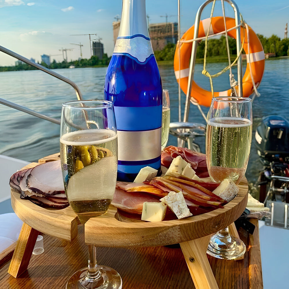 - 🥂Organizer-table made of wood. It is suitable for all those who like to enjoy a glass of wine with delicious cheese or fruit.