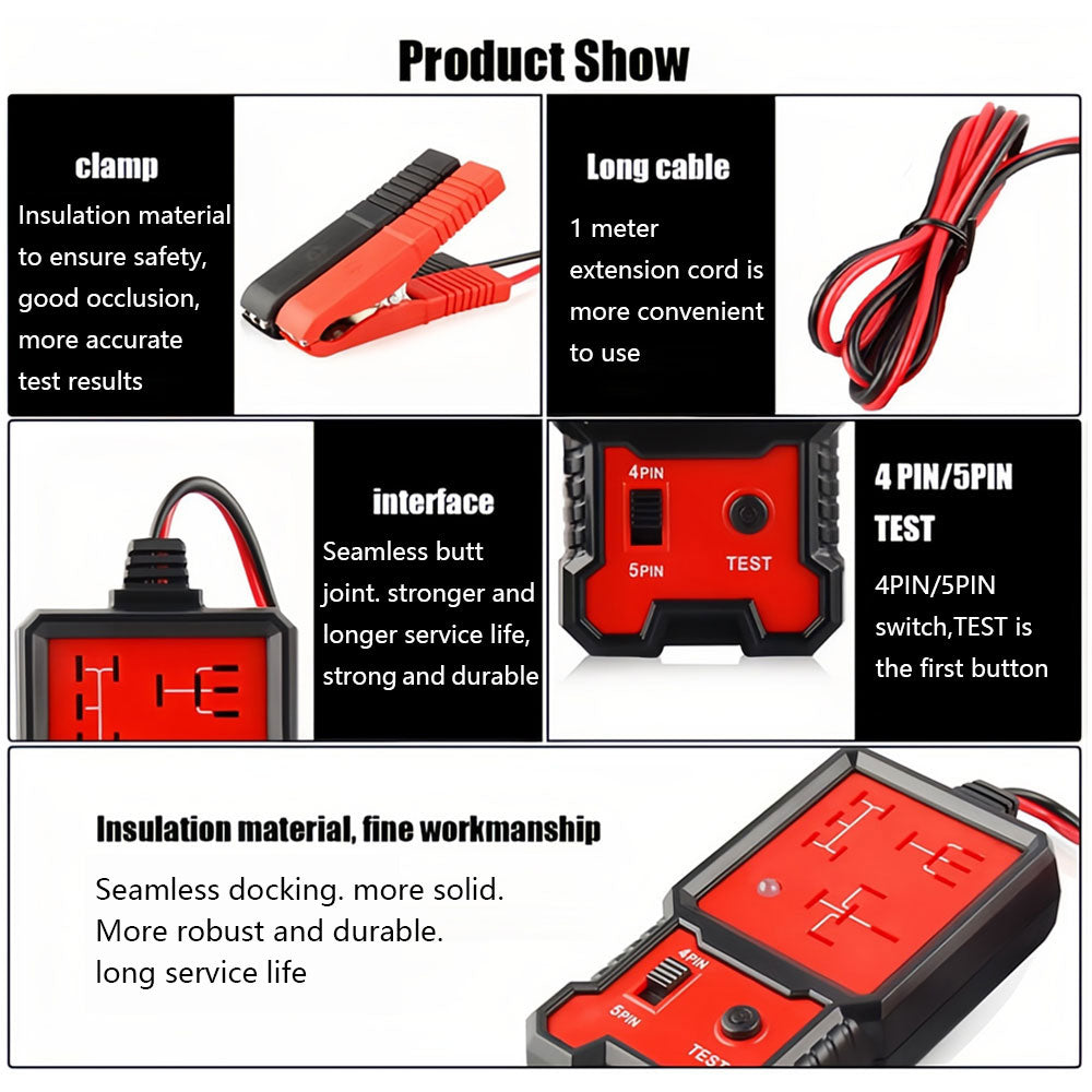 - Suitable for most general-purpose automotive relays on the market. When testing, it needs to be connected to the car's 11V-15V battery. The car battery must be a 12V battery, and the battery voltage must be between 11V-15V; The applicable coil resistance is preferably above 20 ohms.