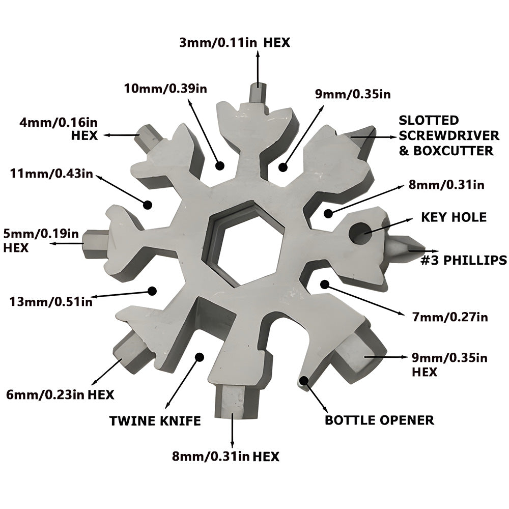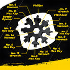 18-in-1 Ultimate Convenience! This amazing consists of a total of 18 different tools, including the regular Philips and flathead screwdriver, No. 3, 4, 5, 6, 7, 8 hex keys, and No. 6, 7, 8, 9, 10, 12, 14 wrenches, even with a bottle opener!