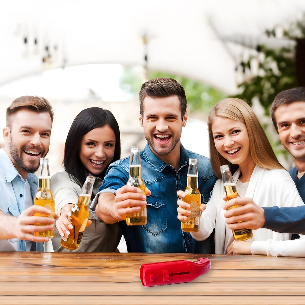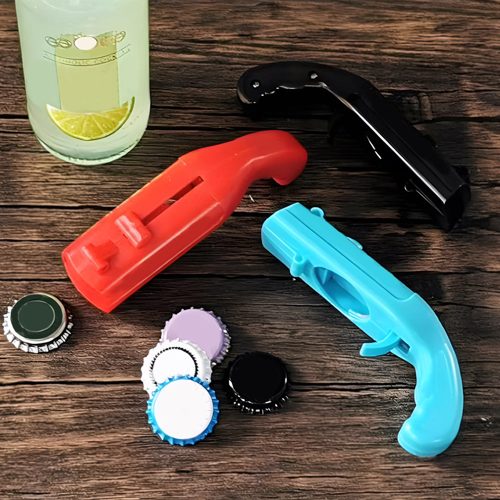 - CAP GUN LAUNCHER: You could take this bottle opener as a cap launcher. It allows you to open the bottle with minimal force. You hold the cap fixed and then it pops up safely and shots the cap more than 5 meters.