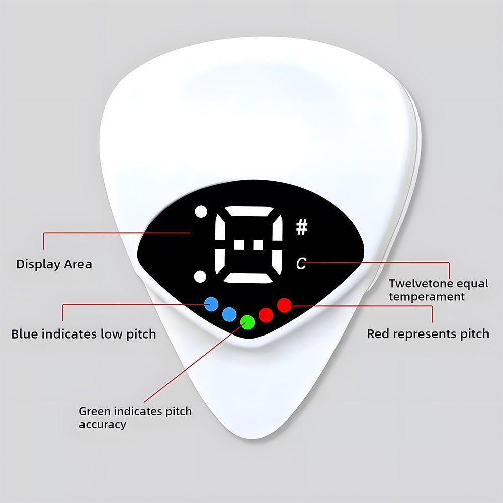 Unique combination of design and function - This pick-shaped guitar tuner breaks the bulky appearance of traditional tuners and cleverly combines the tuner and the pick into one, making it easy for Musicians to tune anytime, anywhere. The streamlined design of the pick is not only beautiful, but also easy to hold, suitable for various playing styles.
