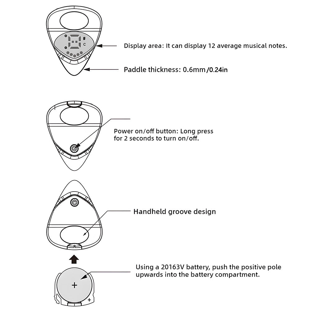 Convenient battery replacement design - Equipped with a CR2016 battery, this tuner is designed with a convenient battery replacement port. No additional tools or complicated steps are required. Users can quickly replace the battery by simply opening the battery compartment. Long-lasting battery life ensures that the tuner can accompany you for longer guitar playing.