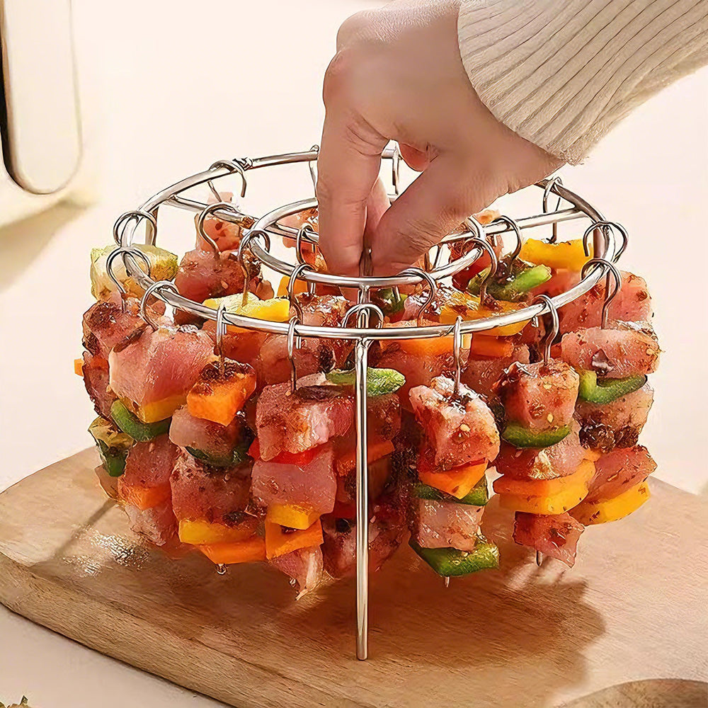 Say goodbye to blotchy veggies or half-raw meatsāthis rack ensures vegetables and meat skewers cook uniformly, locking in juiciness and flavor.The secret lies in its food-grade high-conductivity alloy (3x faster than regular metals!) paired with a bottom ring-shaped heat-gathering groove. Heat radiates from the center outward, wrapping each skewer like an "invisible insulation layer." Whether itās paper-thin mushroom slices or thick pork belly, theyāll absorb heat evenly in no timeālocking in moisture for that perfect "charred outside, tender inside" texture.