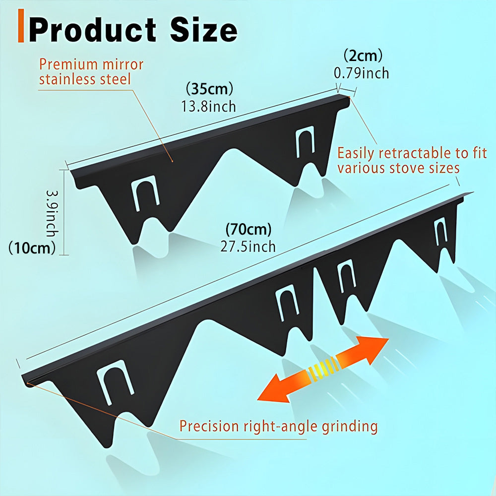 The stove gap filler includes two stainless steel gap fillers with a telescoping design, adjustable from 13.8" (35cm) to 27.5" (70cm) to fit gaps up to 0.79" (2cm).