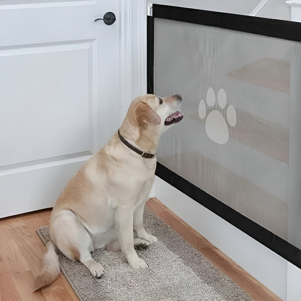 - The Pet Gate is built with tough, partially see-through fiberglass fabric woven to withstand abuse from pets, which is designed to endure pets' claws. so it is very hard to be broken and the dogs can NOT get through easily.