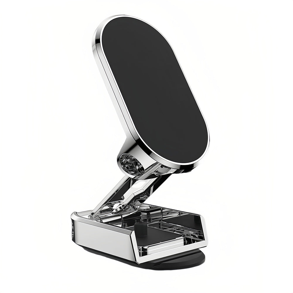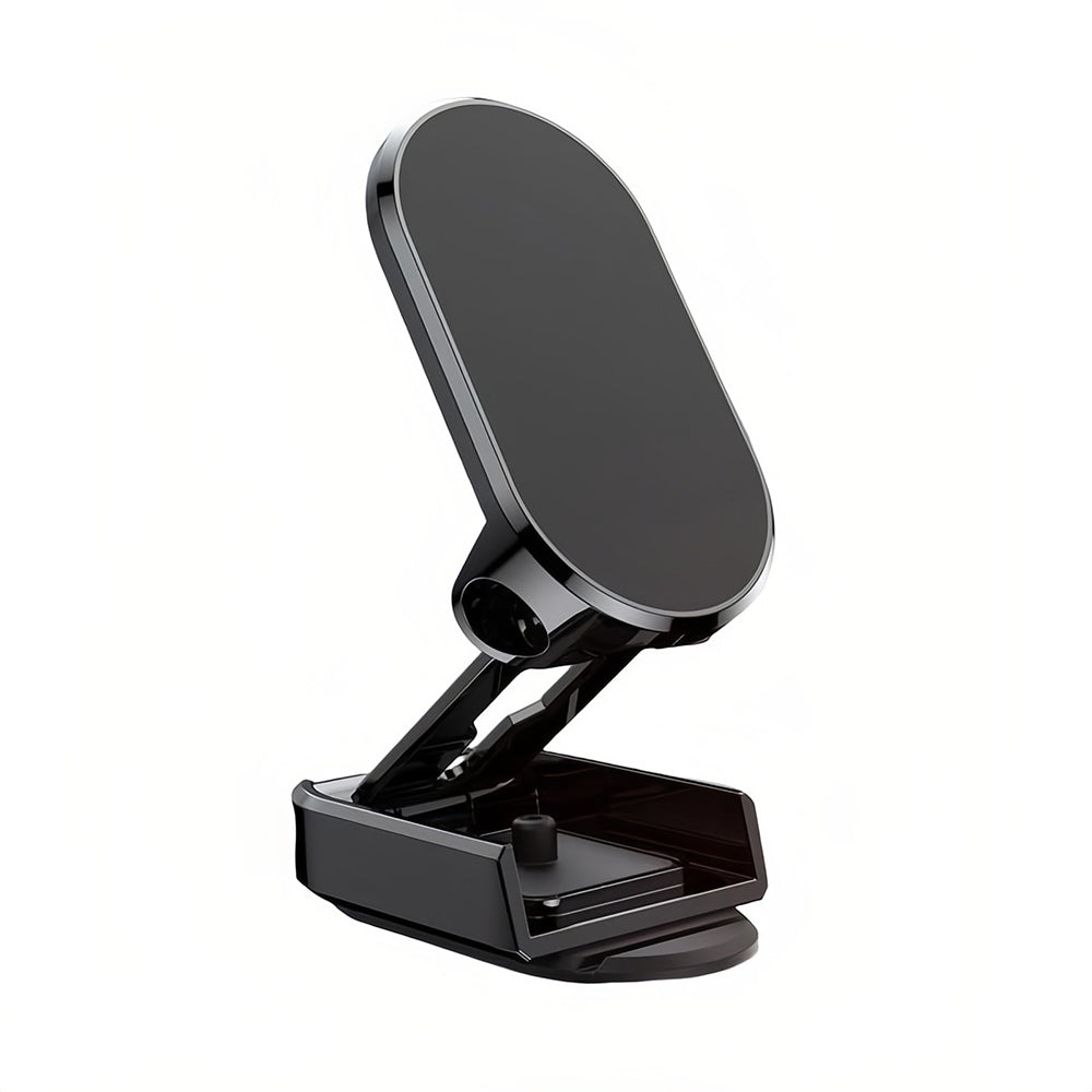 Small and foldable magnetic car mobile phone holder that can be adjusted in height and angle at will and offers a comfortable viewing angle.
