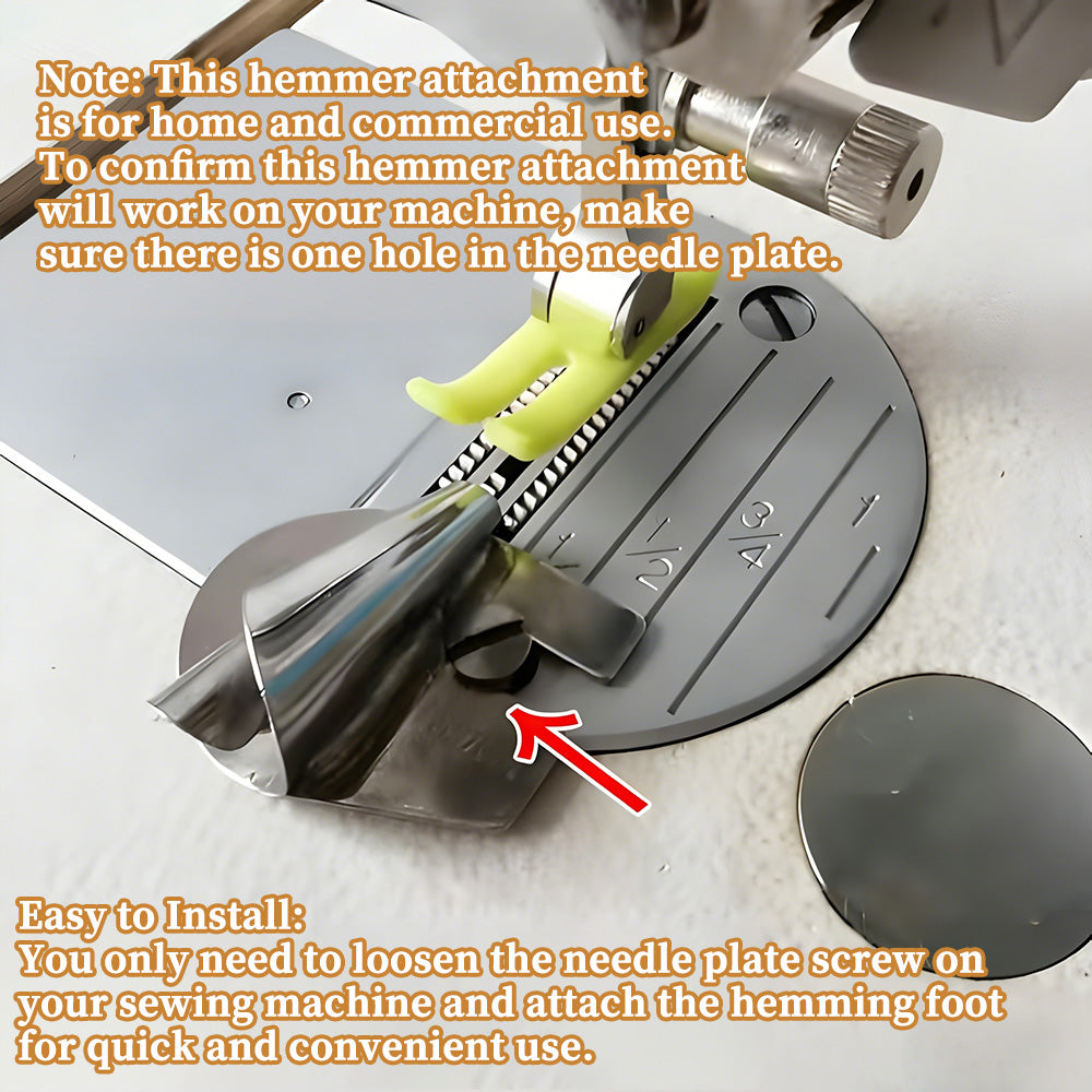 Note: This hemmer attachment is for home and commercial use. To confirm this hemmer attachment will work on your machine, make sure there is one hole in the needle plate.