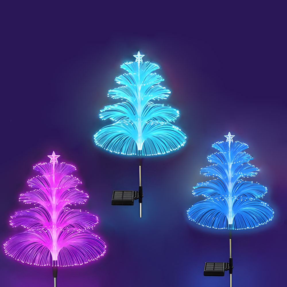 Solar garden lights simulate the real xmas trees shape, unlike ordinary pine tree, solar garden lights are made of high quality fiber optic and ABS material, decorated with fun moon and star accessories on the top. Features strong light transmission, brighter lights and RGB colorful lighting change.