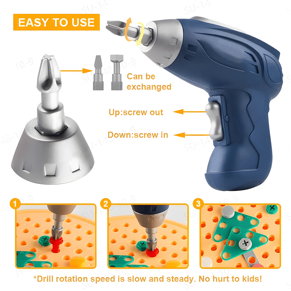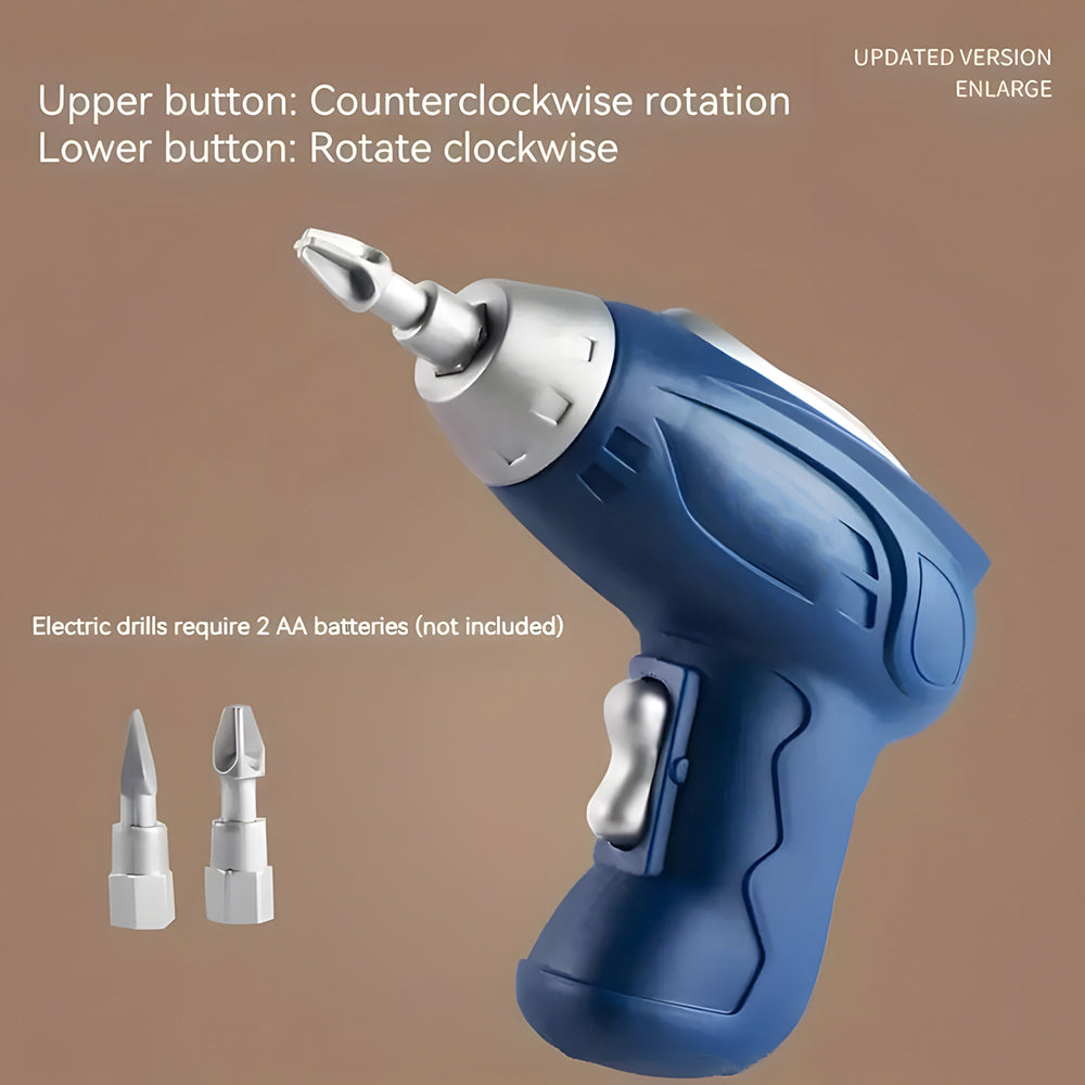 (Tip: The toy drill is powered by AA batteries (batteries not included) and is so slow that you don't have to worry about hurting your child.)