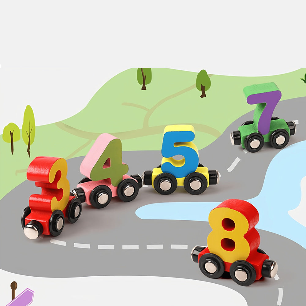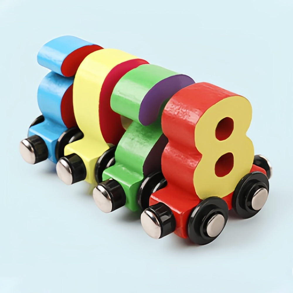 Our Numbers Magnetic Train Puzzle Wooden Toy Car features colorful wooden blocks that can be put together to form a train.