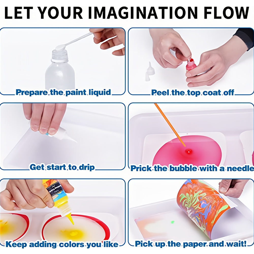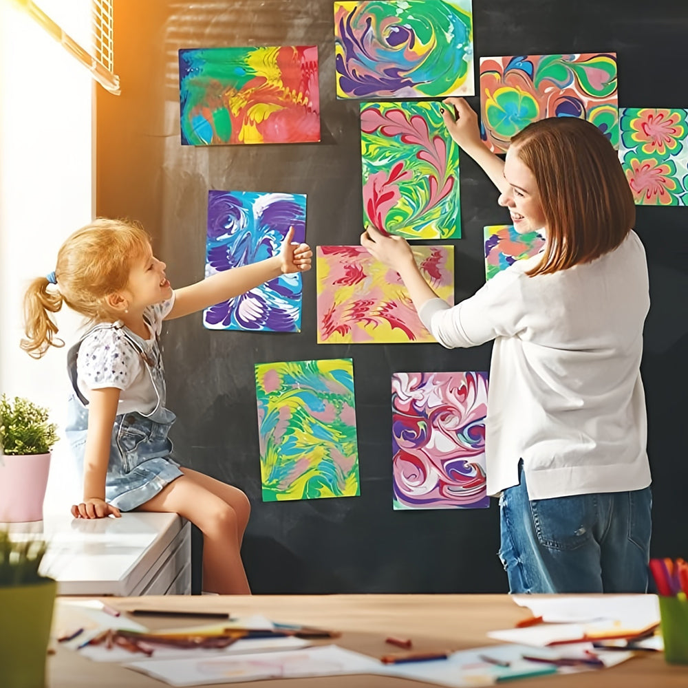 - Simple & Fun – The Water Marbling Paint Set applies a new painting concept to create marble-like patterns on anything. Patterns like flowers, clouds, bursts, hearts, geometrics And more. Just dip your favourite item into the color you like, and it's all done!