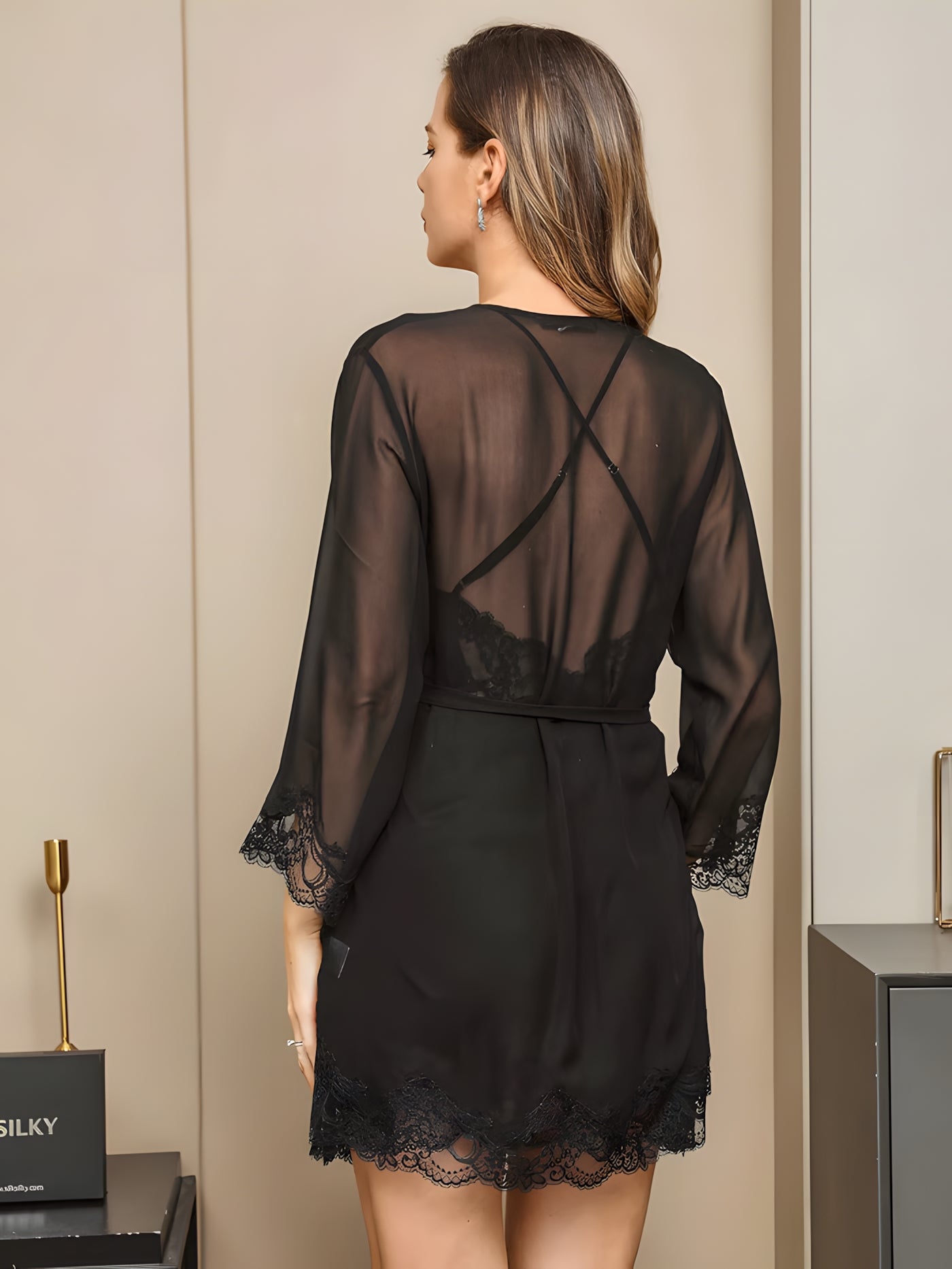 2Pcs Pure Silk Sexy Belted Lace Trimed Nightgown&Robe Set