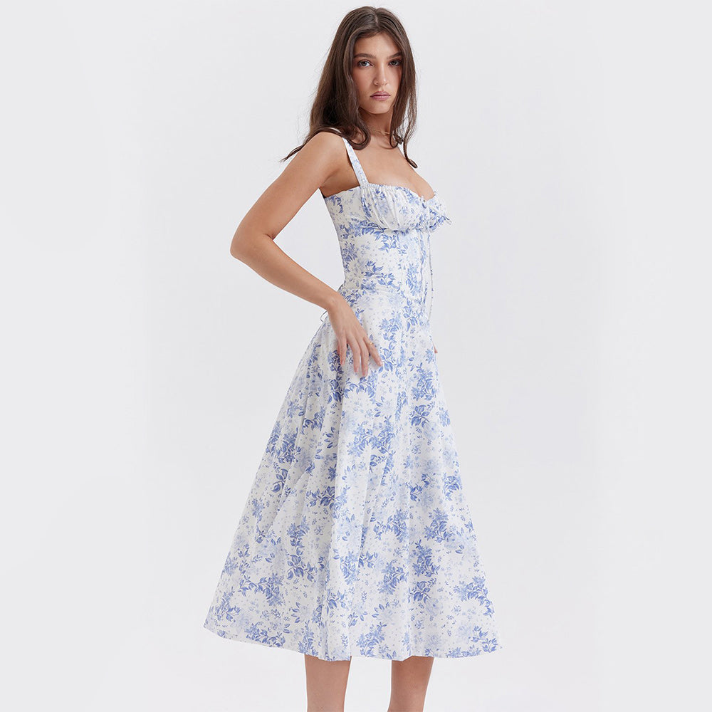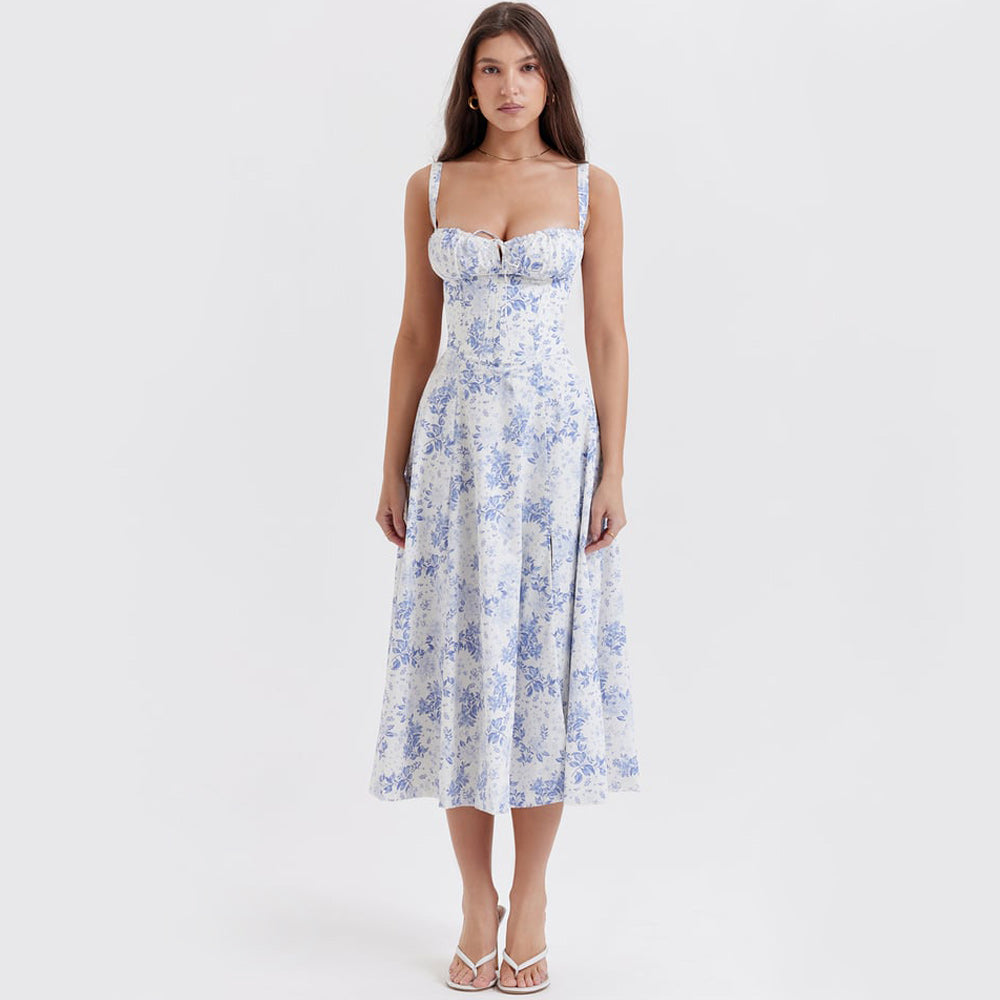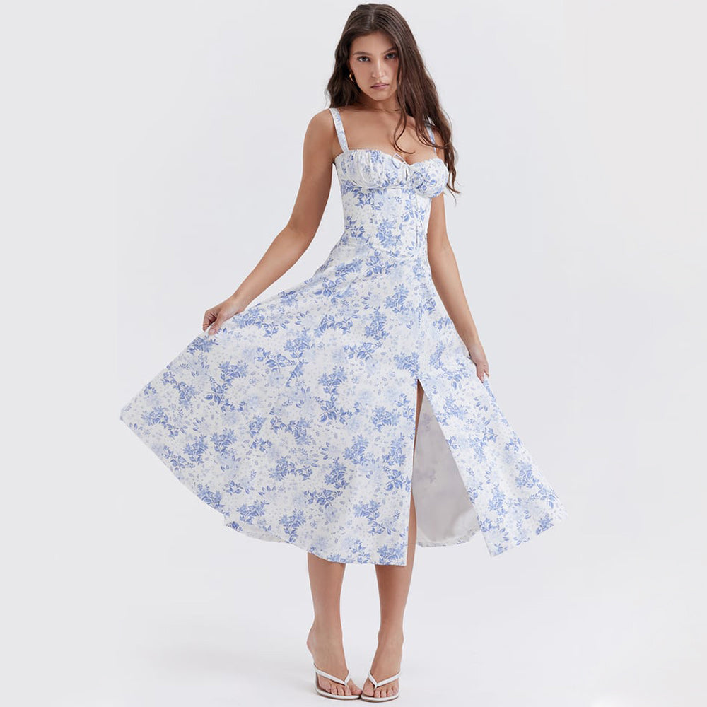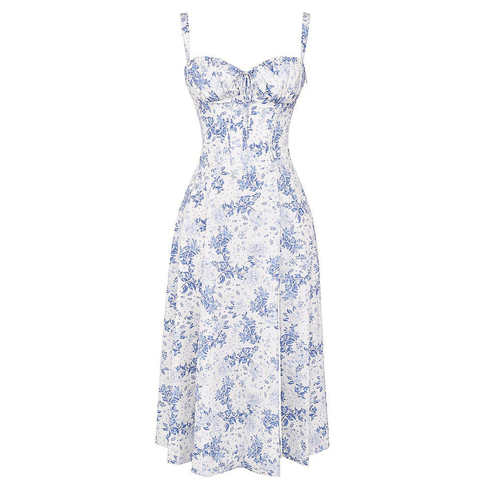 💛💚You'll feel ultra feminine in our dress that's the perfect match for spring and summer garden parties. It's cut from soft polyester in a gorgeous blue print hue. The gathered bust has a drawstring tie and the side split adds a little sexiness to reveal a flash of leg.💜🧡