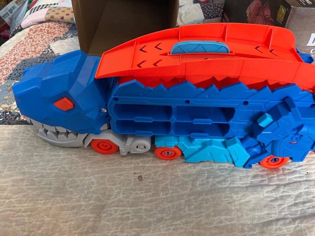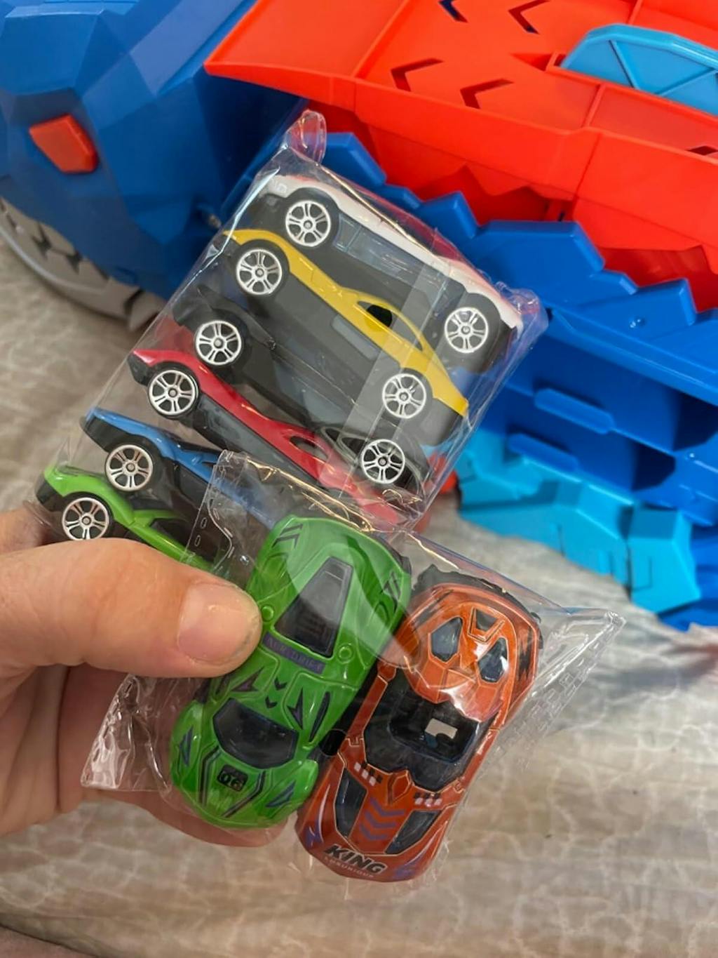 If your kid likes dinosaurs and cars, then this set is a fun starter set. It comes with 8 cars to match the 8 car slots. Inside the Dinos mouth is a rotating device with rubber scoops that will allow the dinosaur to eat the cars. They move into his digestive track and come out the back side. On the Dinos knees are buttons that allow the body to stand erect. These were awkward for me to press so your child will almost certainly need some assistance. Down the back are two racing tracks with a button push to release the cars for a race. The Dino folds up nicely for storage.