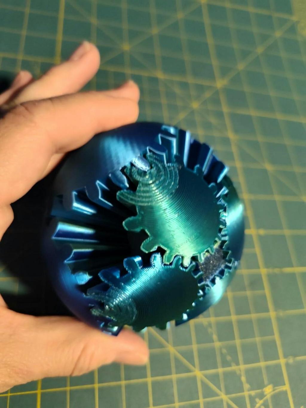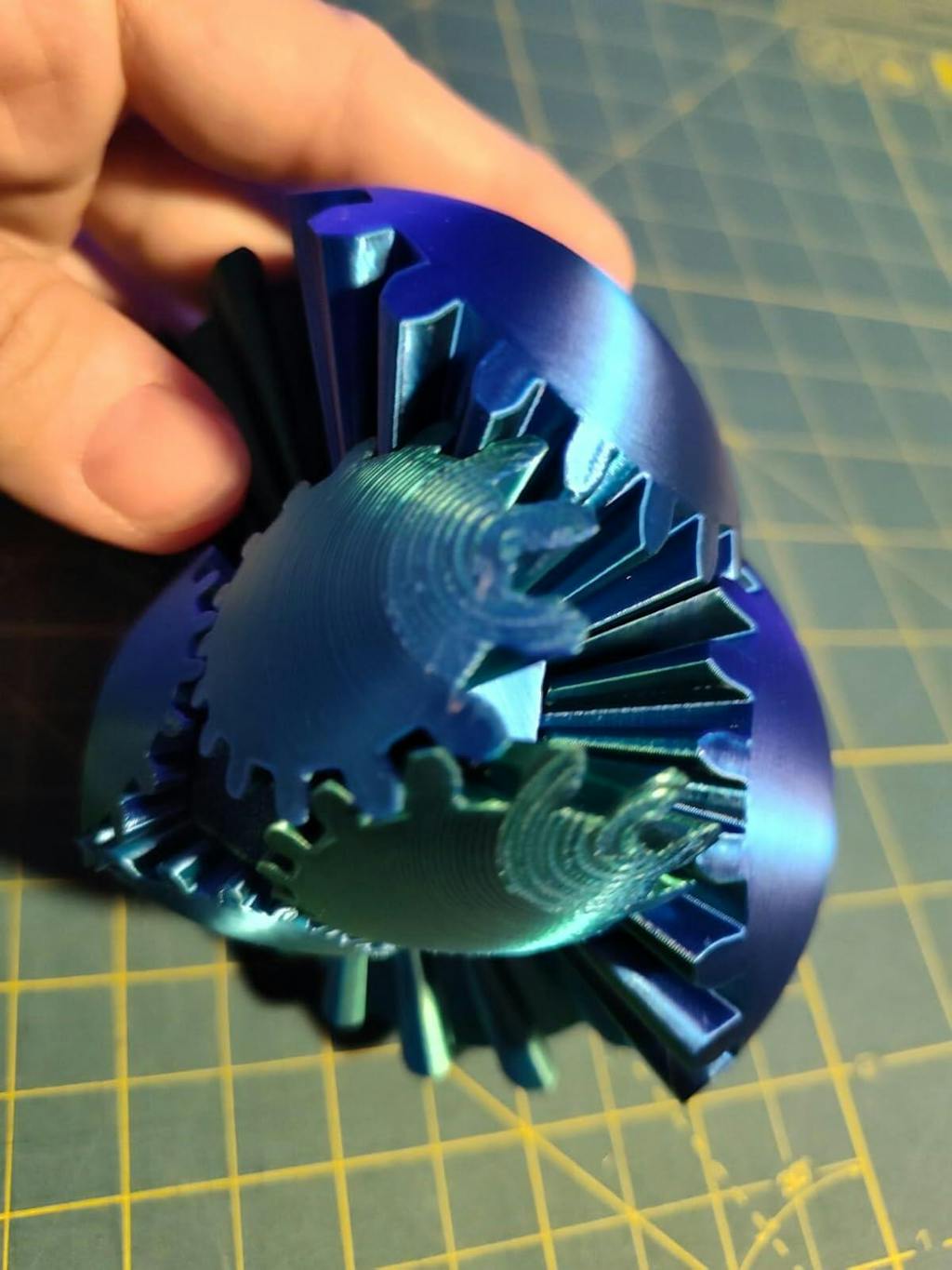 Such a bizarre and fun thing. While it's round in one way, it becomes oblong, or even more distorted shapes the more you turn these gears by squeezing or pushing the surfaces.