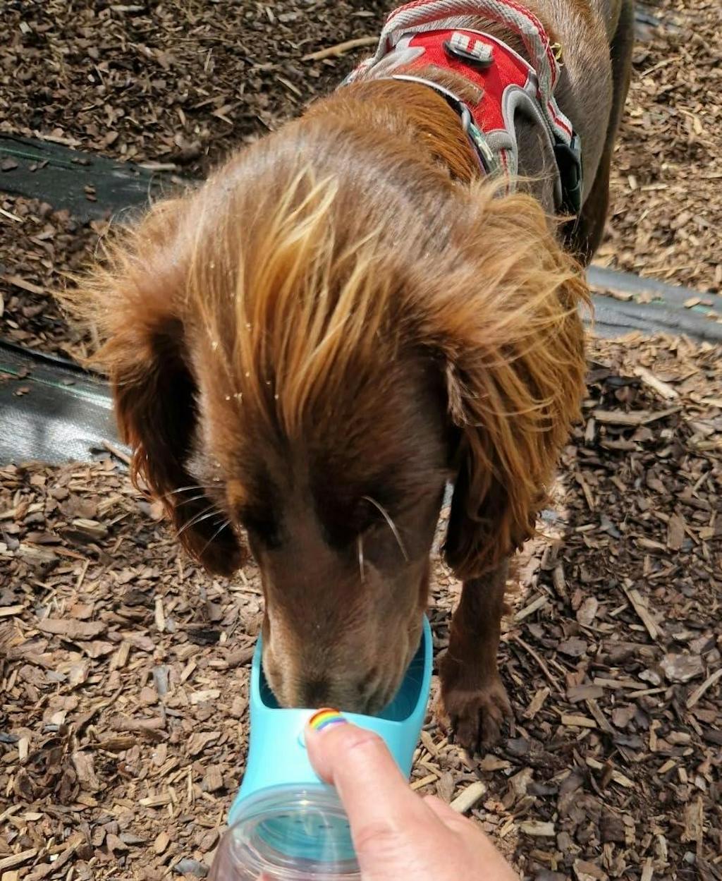Love this bottle so handy to carry with a wrist strap too. my three whippets drink from it with ease I wouldn’t be without it now. So easy to put into a backpack for walking with dogs excellent